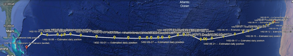 This KML represents a careful reconstruction rather than a claim of exact precision. It shows daily dots marking where Columbus would plausibly have been based on the leagues per day recorded in the log and the west, west southwest, and west northwest course changes he explicitly describes. It includes fixed anchors at La Gomera as the known departure point and Guanahani as the known landfall, connected by a continuous track line so the viewer can visually inspect drift, curvature, and pacing across the voyage. The file documents its assumptions clearly, including the use of one league as approximately three nautical miles, bearings treated as approximate true bearings derived from magnetic courses, and the absence of usable longitude fixes in 1492, which means uncertainty naturally increases in the mid Atlantic. Periods of calm and course changes guided by birds are preserved rather than smoothed away. When viewed, the track bends gently instead of forming a straight line, the days from October sixth through October tenth show noticeable course instability that aligns with crew anxiety and bird sightings, the final approach aligns logically with the Bahamas rather than Cuba or Florida, and the daily pacing feels human, with fast days, slow days, and pauses. Overall, this reconstruction is more historically honest than most published maps.