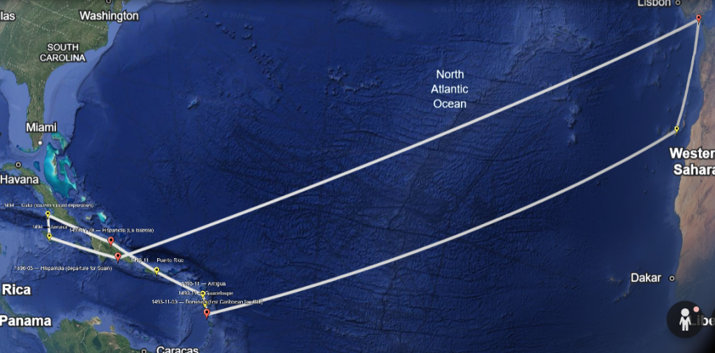This reconstruction was created by identifying every dated or clearly implied location where Columbus is attested to have been present during the second voyage, beginning with the departure from Spain in 1493 and ending with the return in 1496. Each point plotted in the KML corresponds to a place explicitly named in the surviving sources, such as known departures, landfalls, island visits, and extended stays. Rather than inventing daily positions where no distances or headings are recorded, the map anchors itself to these historically supported locations and connects them in chronological order to show the flow of the voyage.