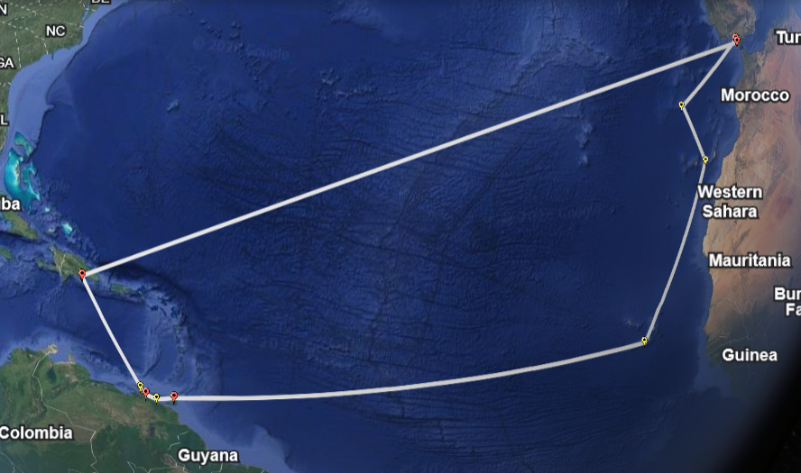 The third voyage of Christopher Columbus is reconstructed differently from the first two because the surviving record emphasizes events and locations rather than continuous navigation. No complete ship’s log survives for this voyage, and the sources that do exist consist primarily of letters, official reports, and later historical compilations that record where Columbus was at specific moments rather than how he traveled day by day. To build this KML, every dated or clearly implied location mentioned in these documents was identified, beginning with the departure from Spain in 1498 and ending with Columbus’s forced return in 1500. Each placemark represents a place where Columbus is explicitly documented to have been present, such as known staging points in the Atlantic, first landfall at Trinidad, exploration of the Gulf of Paria and the South American mainland, extended residence on Hispaniola, and his arrest at Santo Domingo. These anchored locations were then ordered chronologically and connected to show the overall movement of the voyage without imposing artificial precision where the sources are silent. This method reflects the historical reality of the third voyage, which was defined less by open ocean navigation and more by coastal exploration, settlement, and political collapse, and allows the map to remain faithful to what the documentary record can actually support.