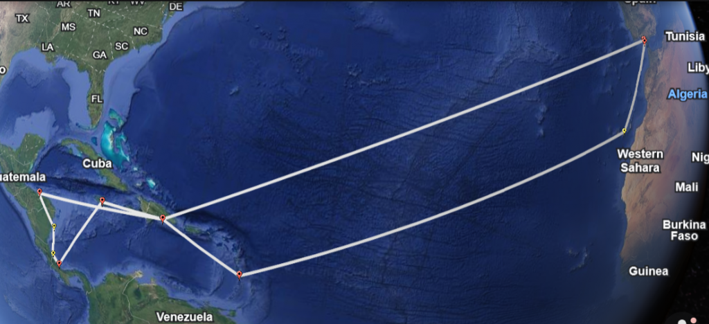 The mapping approach used here is intentionally anchored rather than speculative. Instead of attempting to infer daily positions or routes where no distances or headings are recorded, the KML plots only those places where Columbus is documented to have been present and connects them in chronological order. This method reflects the character of the fourth voyage itself, which was shaped by storms, ship deterioration, political exclusion from Hispaniola, and long periods without movement. Coastal segments along Honduras, Nicaragua, Costa Rica, and the Veragua region are shown as sequential stops rather than continuous tracks, while the Jamaica phase is represented as a fixed location spanning many months. The resulting map presents the fourth voyage as it appears in the historical record, grounded in documentary evidence and free from artificial precision, allowing the geographic scope and narrative progression of Columbus’s final expedition to be examined with clarity and restraint.