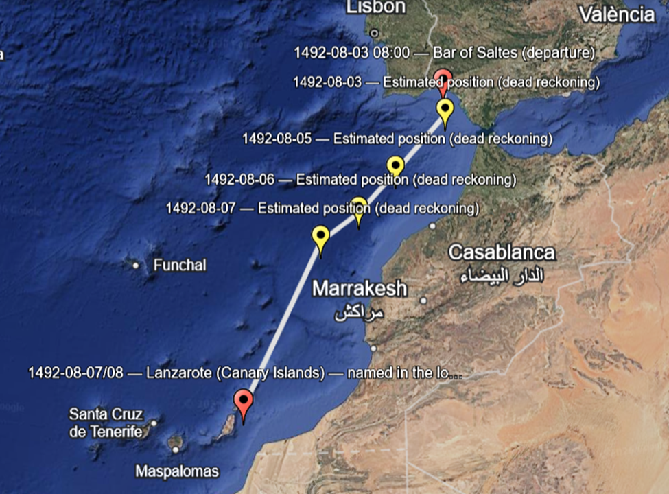 I have always been drawn to history, especially the way our understanding of the past often rests on a surprisingly small number of surviving written sources. In the case of Christopher Columbus, the original ship logs from the first voyage no longer exist. What we have instead are copies, summaries, and transcriptions preserved in the journals and correspondence of others, including versions recorded and translated decades later. These surviving texts, while imperfect, provide a rare day by day narrative of the voyage itself, including distances sailed, compass headings, weather conditions, and Columbus’s own private estimates alongside the figures he reported to his crew. Using the Diario de a bordo and related contemporary compilations and translations, including multiple Spanish and English editions of the first voyage journal and selected letters, it becomes possible to reconstruct the crossing through dead reckoning rather than illustration alone. By combining reported leagues traveled, noted course changes, and observations of magnetic compass behavior recorded in these primary sources, a plausible daily track can be estimated. This project begins that reconstruction by translating the written record into a KML map, allowing the voyage from departure to landfall to be examined one day at a time through the evidence Columbus himself left behind.